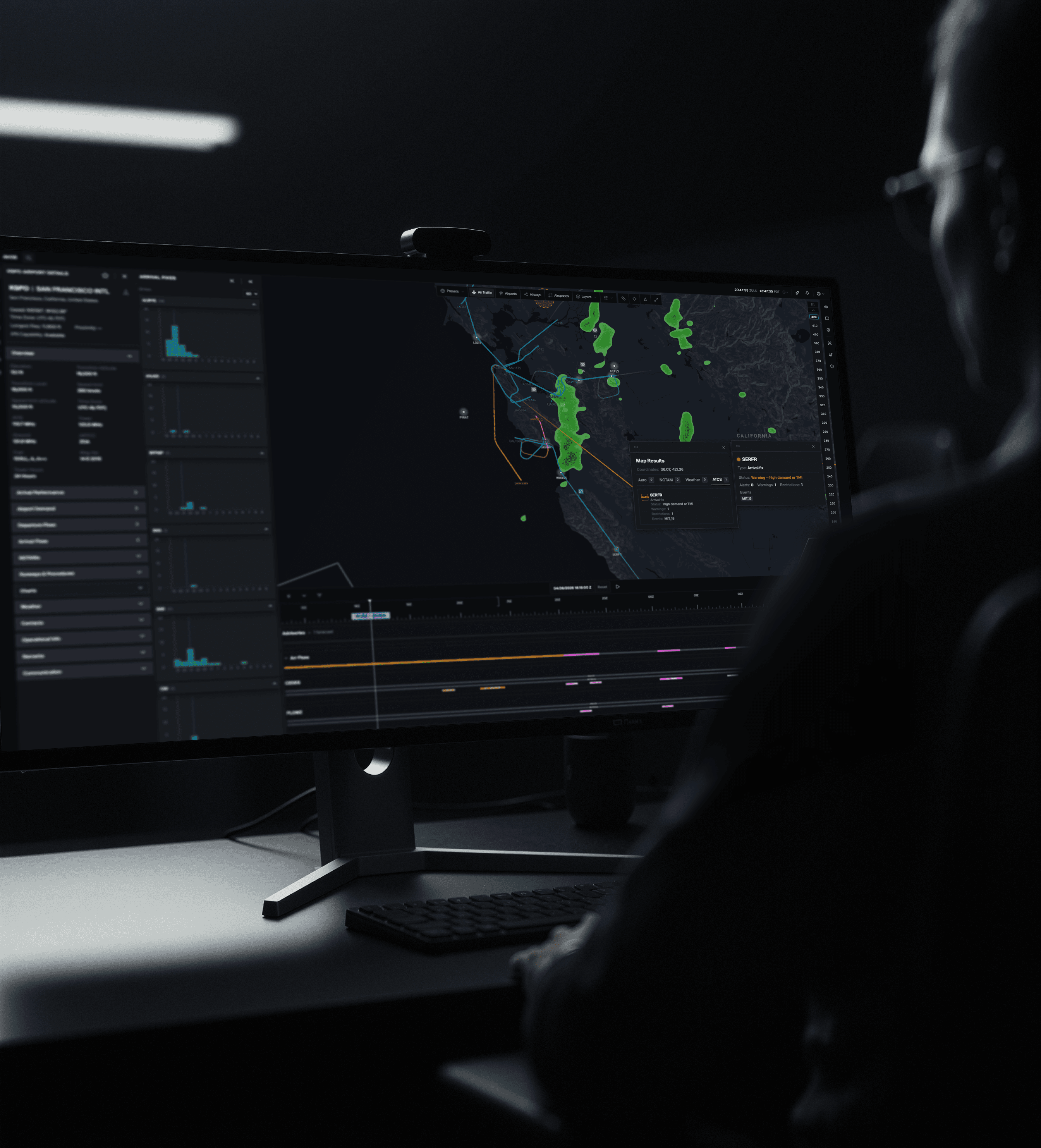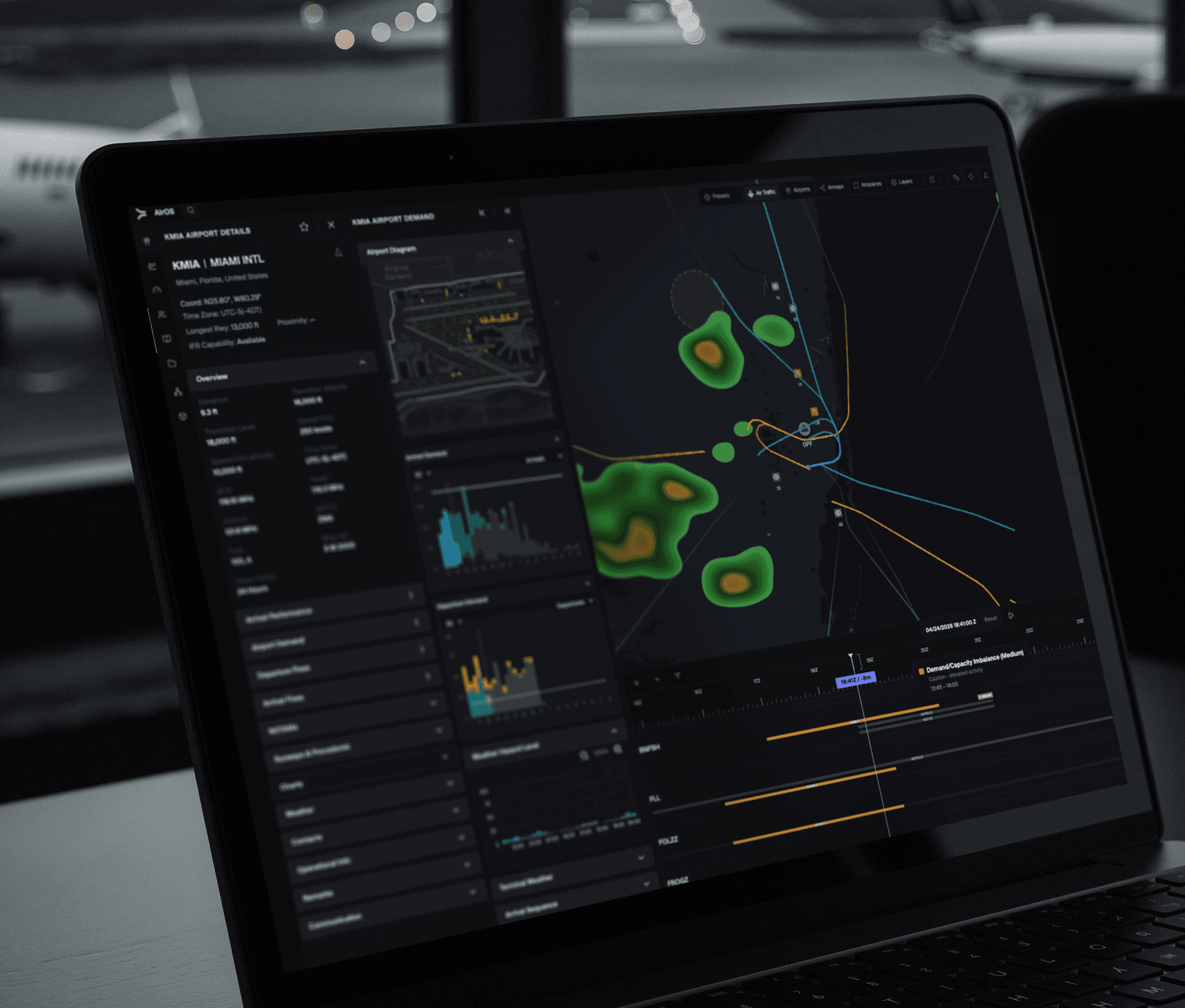 Air-OS connects all data streams: ARINC 424, AMM, OIS, NAS, SWIM, ADS-B, and advanced weather data feeds, continuously forecasts demand-capacity gaps, weather-driven IROPs, and system bottlenecks. Operators see where disruption is forming and receive clear mitigation strategies in advance.